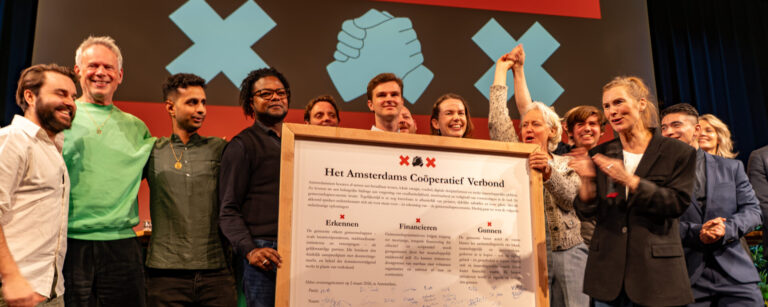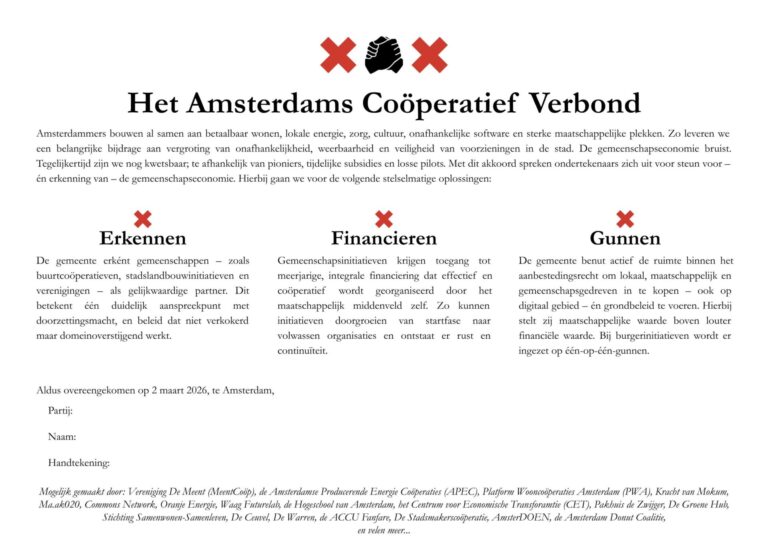 Dat partijen van links tot midden en rechts zich aan tafel schaarden, onderstreept dat de gemeenschapseconomie steeds nadrukkelijker wordt erkend als volwaardige pijler onder een weerbaar, sociaal en rechtvaardig Amsterdam — en als bevestiging dat de kracht van de stad in haar inwoners zelf ligt. Met dit verbond roepen de ondertekenaars de nieuwe gemeenteraad op om de gemeenschapseconomie stevig te verankeren in het coalitieakkoord 2026–2030. We benadrukken dat gemeenschappen al dagelijks bouwen aan betaalbaar wonen, lokale energie, zorg, voedsel en ontmoeting — en vragen de gemeente haar te erkennen, financieren en gunnen: